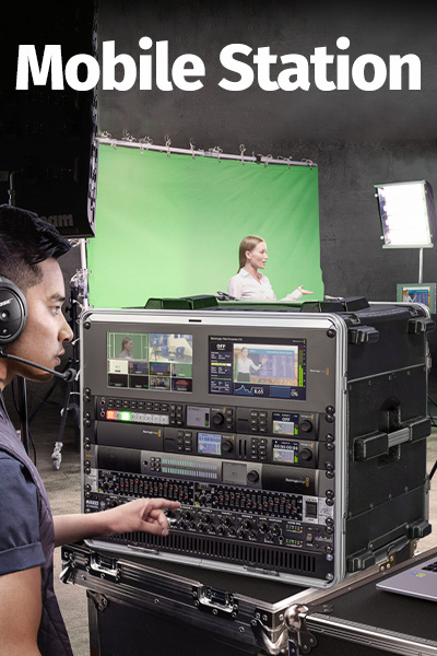 È la più completa e potente gamma di Regie mobili, facilmente trasportabili in un unico comodo case trolley da palco, adatto per ogni occasione: streaming live, recording in tempo reale, ingressi video HDMI e SDI, uscite audio per sonorizzare, ricevitori integrati, mixer audio integrato…